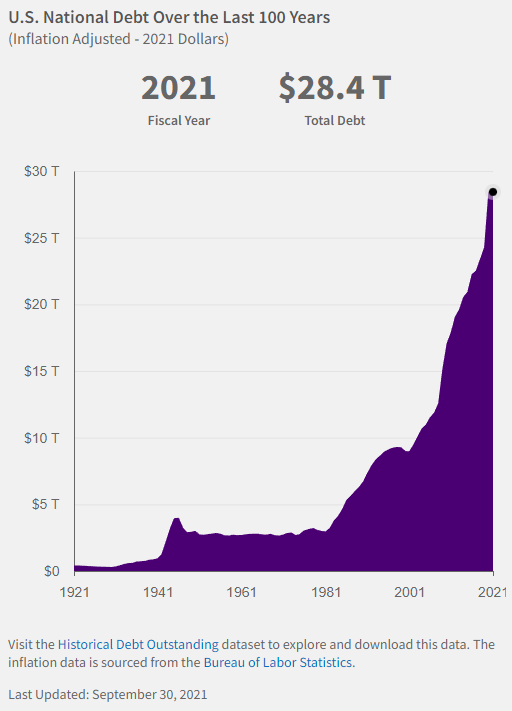 Then there's the national debt, which has ballooned to $30 trillion. In the fiscal years 2019-2021, we increased federal spending by 50%. (See Treasury.gov National Debt.) I can't help but worry we're heading towards a sudden and painful realization that this level of spending is unsustainable. Whether this is in three, five, or ten years, it is reckless to assume we will never have to pay the bill.