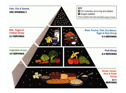 The USDA introduced the food pyramid above in 1992 to illustrate that some foods should be eaten in greater quantities than others. Note bread, rice, and pasta proudly holding up the base of the pyramid.