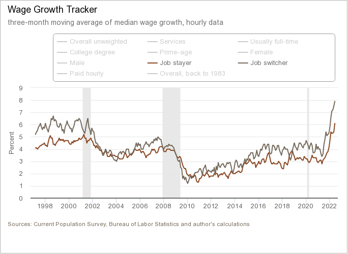 The Journal article discusses data from the Federal Reserve Bank of Atlanta indicating that job switchers in 2022 saw raises of 6.4%, while job stayers saw increases of only 4.7%. Never mind that today's market is not unusual. There is almost always a spread between job switchers and stayers, and job switchers typically increase their salary as part of a switch: